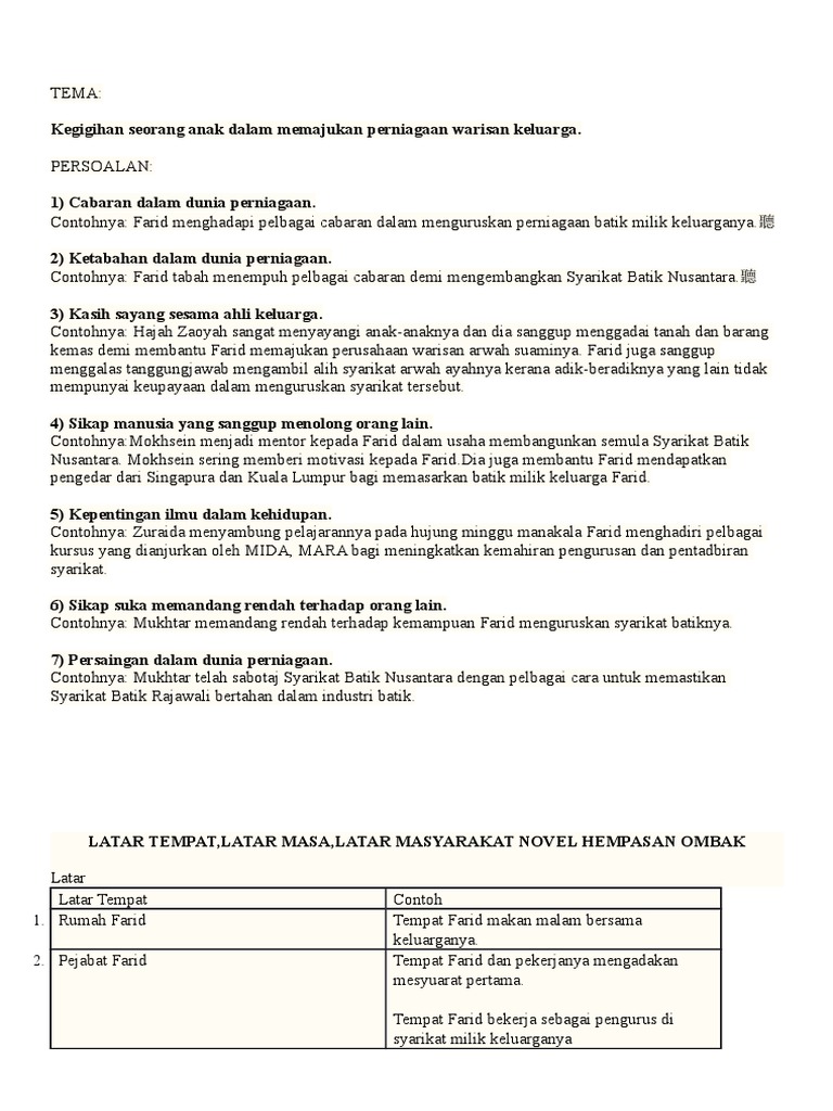 Contoh Soalan Novel Tingkatan 3 Hempasan Ombak. Berikutnya tema, persoalan, plot, gaya bahasa, nilai, pengajaran, latar tempat, latar masa, latar masyarakat, watak . Watak utama dalam novel ini ialah farid.